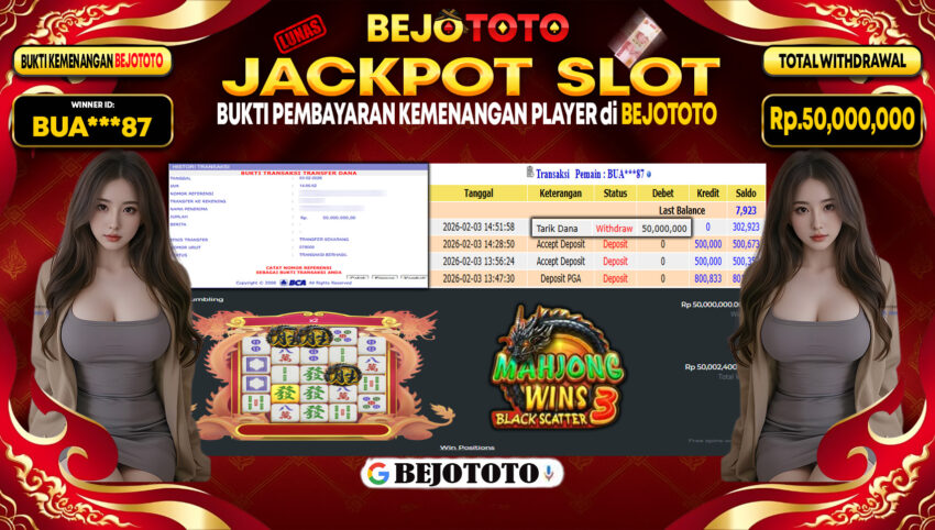BEJOTOTO – Selamat kepada User id : BUA***87 Telah berhasil mendapatkan kemenangan besar pada permainan  SLOT PRAGMATIC MAHJONG WINS 3 – BLACK SCATTER Dengan kemenangan Sebesar Rp.50,000,000,-. Setelah mengisi formulir withdraw dengan kurung waktu hanya 5 – 10 menit pihak BEJOTOTO sudah melakukan transfer kepada pemilik Userid dan dana sudah dapat di cairkan oleh pemenang. Bukti pembayaran yang kami berikan merupakan bukti pembayaran yang SAH / VALID yang langung di dapatkan melaui tanda transfer transaksi dari Bank yang di tuju.