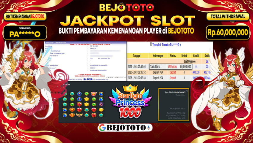 BEJOTOTO – Selamat kepada User id : PA*****O Telah berhasil mendapatkan kemenangan besar pada permainan  SLOT PRAGMATIC PRAGMATIC STARLIGHT PRINCESS 1000 Dengan kemenangan Sebesar Rp.60,000,000,-. Setelah mengisi formulir withdraw dengan kurung waktu hanya 5 – 10 menit pihak BEJOTOTO sudah melakukan transfer kepada pemilik Userid dan dana sudah dapat di cairkan oleh pemenang. Bukti pembayaran yang kami berikan merupakan bukti pembayaran yang SAH / VALID yang langung di dapatkan melaui tanda transfer transaksi dari Bank yang di tuju.