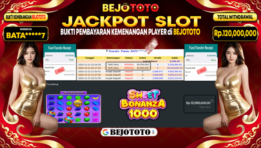 BEJOTOTO – Selamat kepada User id : BATA*****7 Telah berhasil mendapatkan kemenangan besar pada permainan SLOT PRAGMATIC PRAGMATIC SWEET BONANZA 1000 Dengan kemenangan Sebesar Rp.120,000,000,-. Setelah mengisi formulir withdraw dengan kurung waktu hanya 5 – 10 menit pihak BEJOTOTO sudah melakukan transfer kepada pemilik Userid dan dana sudah dapat di cairkan oleh pemenang. Bukti pembayaran yang kami berikan merupakan bukti pembayaran yang SAH / VALID yang langung di dapatkan melaui tanda transfer transaksi dari Bank yang di tuju.