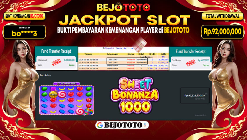 BEJOTOTO – Selamat kepada User id : bo****3 Telah berhasil mendapatkan kemenangan besar pada permainan SLOT PRAGMATIC PRAGMATIC SWEET BONANZA 1000 Dengan kemenangan Sebesar Rp.92,000,000,-. Setelah mengisi formulir withdraw dengan kurung waktu hanya 5 – 10 menit pihak BEJOTOTO sudah melakukan transfer kepada pemilik Userid dan dana sudah dapat di cairkan oleh pemenang. Bukti pembayaran yang kami berikan merupakan bukti pembayaran yang SAH / VALID yang langung di dapatkan melaui tanda transfer transaksi dari Bank yang di tuju.