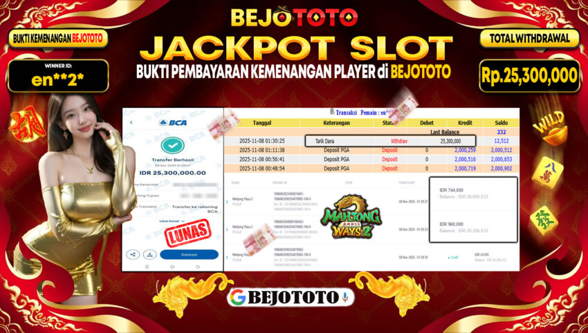 BEJOTOTO – Selamat kepada User id : en**2* Telah berhasil mendapatkan kemenangan besar pada permainan SLOT MAHJONG WAYS-2 Dengan kemenangan Sebesar Rp.25,300,000-. Setelah mengisi formulir withdraw dengan kurung waktu hanya 5 – 10 menit pihak BEJOTOTO sudah melakukan transfer kepada pemilik Userid dan dana sudah dapat di cairkan oleh pemenang. Bukti pembayaran yang kami berikan merupakan bukti pembayaran yang SAH / VALID yang langung di dapatkan melaui tanda transfer transaksi dari Bank yang di tuju.