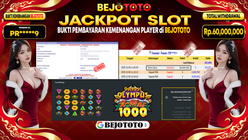 BEJOTOTO – Selamat kepada User id : PR*****9 Telah berhasil mendapatkan kemenangan besar pada permainan  SLOT PRAGMATIC GATES OF OLYMPUS X-MAS 1000  Dengan kemenangan Sebesar Rp.60,000,000,-. Setelah mengisi formulir withdraw dengan kurung waktu hanya 5 – 10 menit pihak BEJOTOTO sudah melakukan transfer kepada pemilik Userid dan dana sudah dapat di cairkan oleh pemenang. Bukti pembayaran yang kami berikan merupakan bukti pembayaran yang SAH / VALID yang langung di dapatkan melaui tanda transfer transaksi dari Bank yang di tuju.