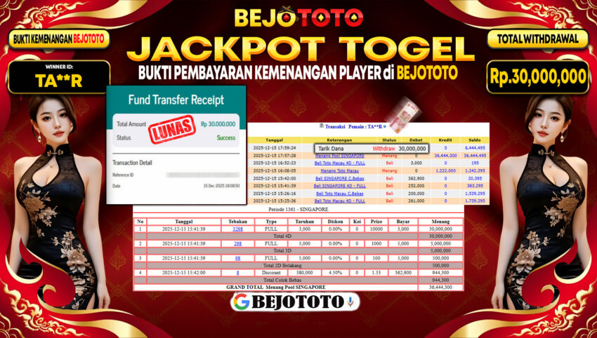 BEJOTOTO – Selamat kepada User id : TA**R Telah berhasil mendapatkan kemenangan besar pada permainan TOGEL SINGAPORE POOLS Dengan kemenangan Sebesar Rp.30,000,000,-. Setelah mengisi formulir withdraw dengan kurung waktu hanya 5 – 10 menit pihak BEJOTOTO sudah melakukan transfer kepada pemilik Userid dan dana sudah dapat di cairkan oleh pemenang. Bukti pembayaran yang kami berikan merupakan bukti pembayaran yang SAH / VALID yang langung di dapatkan melaui tanda transfer transaksi dari Bank yang di tuju.