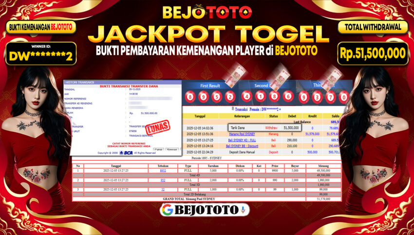 BEJOTOTO – Selamat kepada User id : DW*******2 Telah berhasil mendapatkan kemenangan besar pada permainan TOGEL SYDNEY LOTTO Dengan kemenangan Sebesar Rp.51,500,000,-. Setelah mengisi formulir withdraw dengan kurung waktu hanya 5 – 10 menit pihak BEJOTOTO sudah melakukan transfer kepada pemilik Userid dan dana sudah dapat di cairkan oleh pemenang. Bukti pembayaran yang kami berikan merupakan bukti pembayaran yang SAH / VALID yang langung di dapatkan melaui tanda transfer transaksi dari Bank yang di tuju.