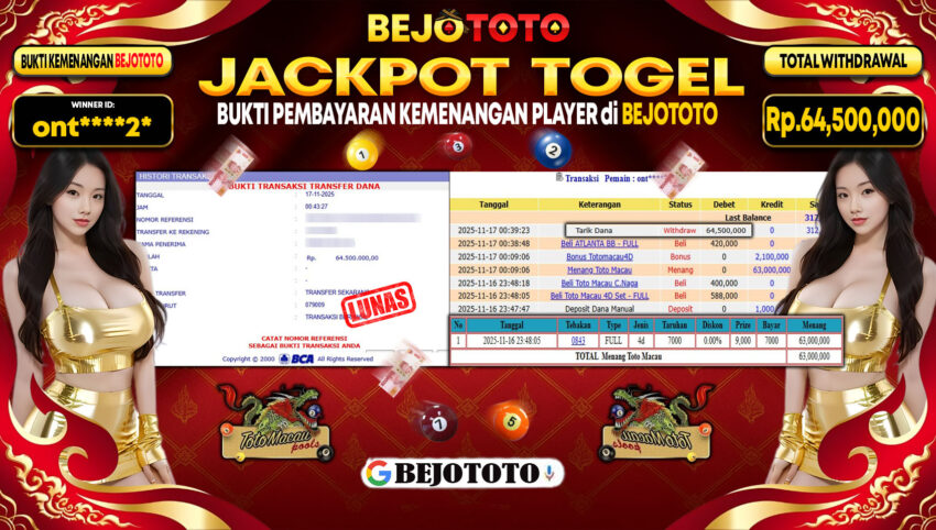 BEJOTOTO – Selamat kepada User id : ont***2 Telah berhasil mendapatkan kemenangan besar pada permainan TOGEL TOTOMACAU 4D Dengan kemenangan Sebesar Rp.64,500,000,-. Setelah mengisi formulir withdraw dengan kurung waktu hanya 5 – 10 menit pihak BEJOTOTO sudah melakukan transfer kepada pemilik Userid dan dana sudah dapat di cairkan oleh pemenang. Bukti pembayaran yang kami berikan merupakan bukti pembayaran yang SAH / VALID yang langung di dapatkan melaui tanda transfer transaksi dari Bank yang di tuju.